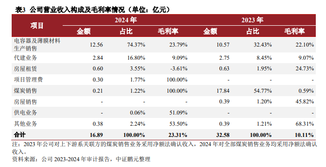 记者注释到,在《推崇》追踪期内,铜陵大江代建业务收入略有增长,其子公司安徽铜峰电子股份有限公司 (简称“铜峰电子”)握续扩产高端薄膜材料、电容器产能,收入结构优化且界限保握增长。不外,其2024年煤炭销售业务收入大幅下落。