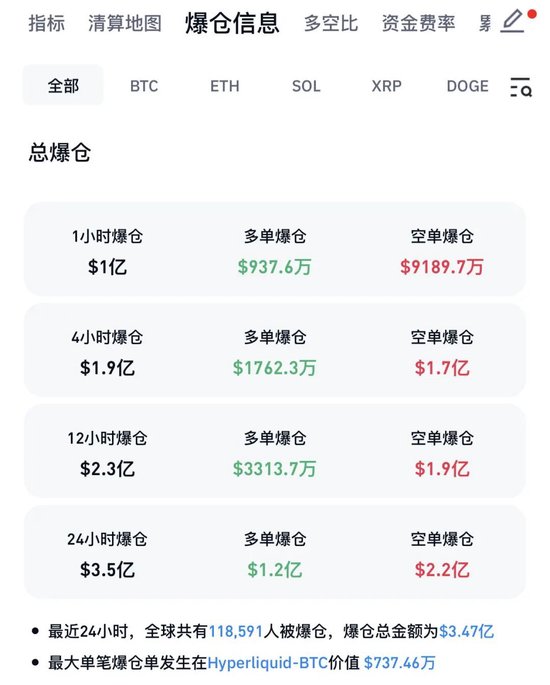 CoinGlass夸耀,近24小时公共共有近12万东谈主爆仓,爆仓总金额为3.47亿好意思元。