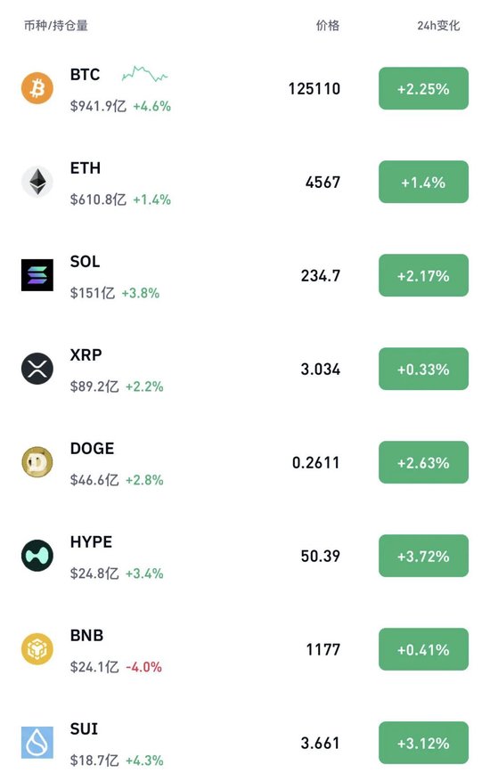 此外,以太坊涨超1%,狗狗币、SOL涨超2%,HYPE涨近4%。